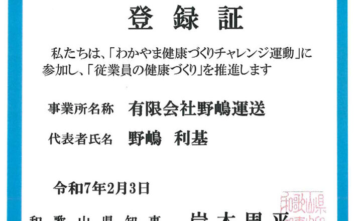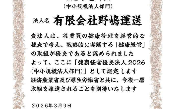 有限会社野嶋運送は、従業員の健康管理を経営的な視点で捉え、戦略的に実践している企業として、「健康経営優良法人2026(中小規模法人部門)」の認定を取...